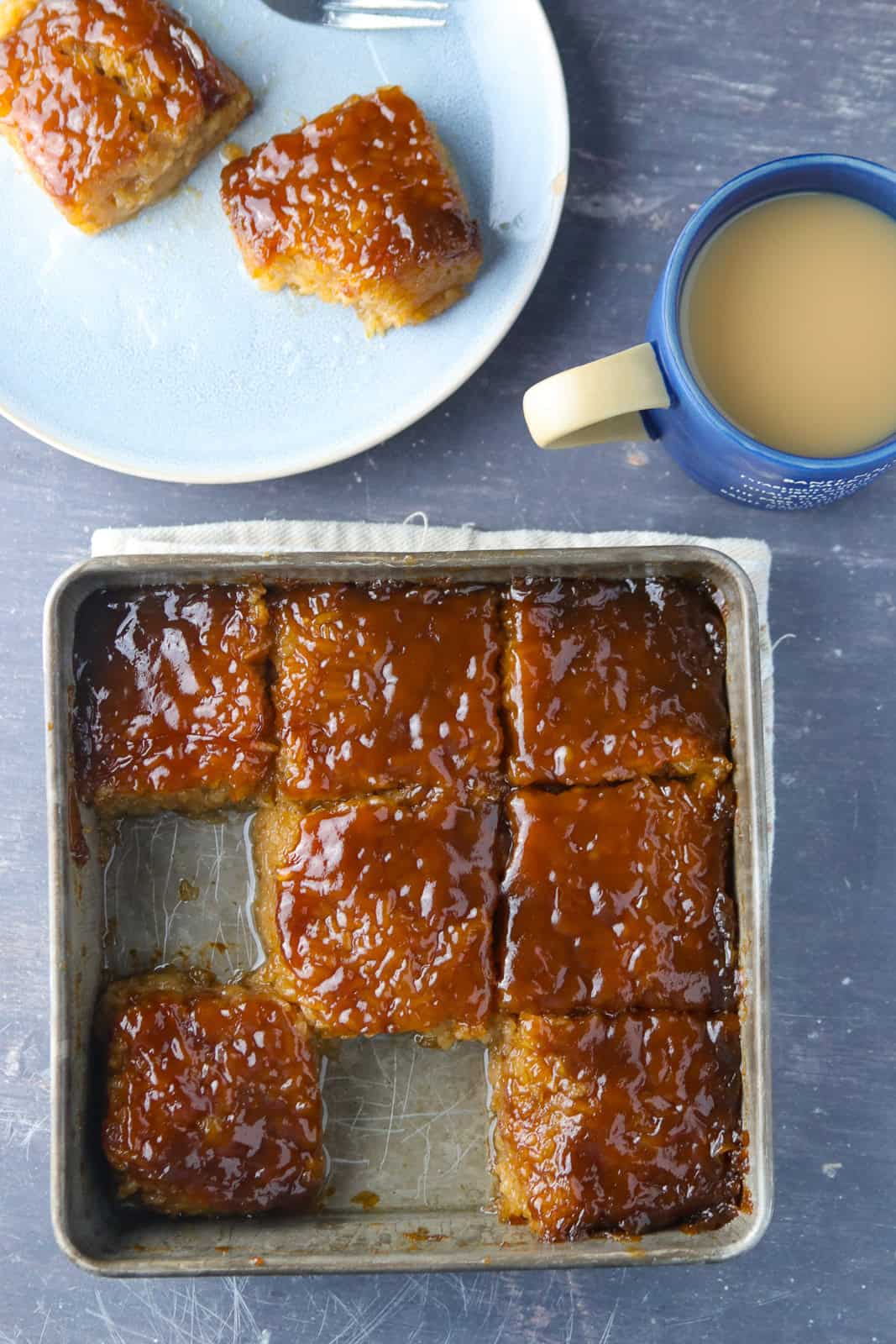 Biko Squares in a pan. Served with coffee.